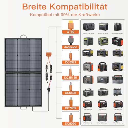 Hocheffizient: Mit monokristallinen Silizium-Solarzellen und einer branchenführenden Umwandlungsrate von 23,5% können MHPOWOS-Solarmodule Ihren Solargenerator / Ihr Kraftwerk schneller und effizienter denn je aufladen. Stecker in die meisten Kraftwerke mit Solar-Stecker zu booten. • Einfach zu installieren: MHPOWOS 110W Solarpanel Ausgestattet mit einem professionellen Solarausgang Schnittstelle, keine komplizierten Installationsverfahren erforderlich sind, Plug and Play, Installation dauert weniger als 10S, Kann schnell Ihr Kraftwerk, Solargenerator, RV und andere Geräte aufladen, • Zusammenklappbar & tragbar & wasserdicht & staubdicht: MHPOWOS 110W Solarpanel wiegt nur 4.5kg. Es lässt sich zusammenfalten wie eine Aktentasche und kann überallhin mitgenommen werden. Ideal als Wohnmobil-Solarpanel, Camping-Solarpanel und Outdoor-Panel. Überall aufladen. Und das 110W Solarpanel ist nach IP67 wasserdicht, diese tragbaren Solarpanels sind für den Außenbereich gemacht und können den Elementen widerstehen. • Kompatibel mit den meisten Solargeneratoren: MHPOWOS 110W Portable Solarpanel mit einem gemeinsamen Solarausgang Schnittstelle ausgestattet, ist kompatibel mit den meisten tragbaren Kraftwerk / Solar Generator auf dem Markt. • Paketinhalt: MHPOWOS 110W faltbares Solarmodul, Solarverlängerungskabel zum 7-in-1 Kabel, Bedienungsanleitung.