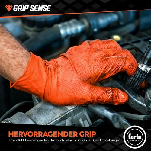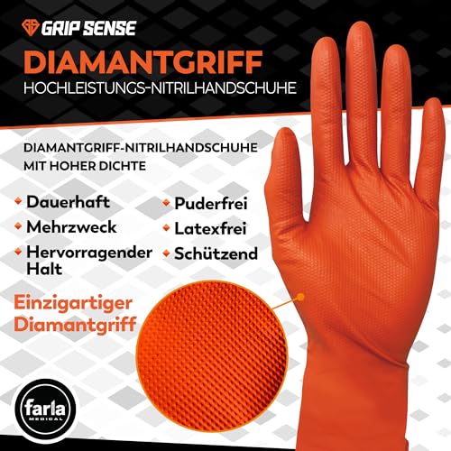 Exzellenter Grip – Gripsense Nitrilhandschuhe verfügen über eine einzigartige Diamant-Griff-Textur, die selbst in fettigen Umgebungen einen hervorragenden Halt bietet. • Puder- und latexfrei – Unsere Nitril-Einweghandschuhe enthalten kein Latex oder Puder, um Hautirritationen zu reduzieren und das Risiko einer Kontamination in empfindlichen Umgebungen zu vermeiden. • LANGLEBIG – Gripsense orange Einweghandschuhe sind die perfekten Mechanikerhandschuhe für DIY-Projekte. Hergestellt aus einem strapazierfähigen Nitril, sind diese Handschuhe robust und reißfest. Sie haben auch eine hervorragende Dehnung, so dass sie bequem zu tragen für längere Zeit. • Vielseitig einsetzbar: Diese puderfreien Handschuhe sind geeignet für eine breite Palette von Anwendungen, einschließlich Landwirtschaft, Mechanik, Maschinenbau und allgemeine Nutzung. • Schutzhandschuhe – Mit einer maximalen Fingerfertigkeit von 5 bieten diese Handschuhe ein ausgewogenes Verhältnis von Komfort, Geschicklichkeit und gutem Schutz.