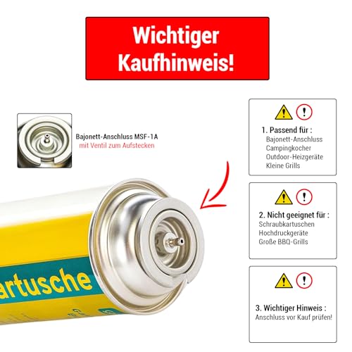 [CAMPINGMAN GAS CARTRIDGES 227g]: sind die beste Wahl für Ihre Outdoor-Aktivitäten. Campingman Gaskartuschen sind für alle Geräte geeignet, die mit einer Standardkartusche 227g betrieben werden können. Campingman Gaskartuschen für Lötlampen, Campingkocher, Campinglampen und ähnliche Geräte. – TYP: MSF-1a • [VIELSEITIG EINSETZBAR]: Campingman Gaskartuschen 227g sind die beste Wahl für Ihre Outdoor-Aktivitäten. Campingman Gaskartuschen eignen sich für alle Geräte, die mit einer Standardkartusche 227g betrieben werden können. Campingman Gaskartuschen für Lötlampen, Campingkocher, Campinglampen und ähnliche Geräte. • [ZUVERLÄSSIG]: Die hohe Qualität unserer Produkte wird durch strengste Qualitätskontrollen während der Produktion und Lagerung gewährleistet. • [STANDART-KARTUSCHEN]: Die Campingman 227g Gaskartuschen sind flexibel und vielseitig einsetzbar. Sie können sie in all Ihren Geräten verwenden, die mit Standard 227g-Kartuschen funktionieren. Campingman 227g Gaskartuschen sind geeignet für Lötlampen, Campingkocher, Campinglampen und ähnliche Geräte. • Sicher & geprüft – Hochwertige Verarbeitung mit sicherem Ventilmechanismus für kontrollierte Gasabgabe. • Wichtiger Hinweis zur Kompatibilität – Nicht für Schraubkartuschen oder Hochdruckgeräte geeignet. Vor dem Kauf Anschluss prüfen!