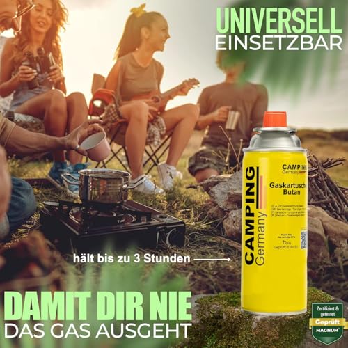 | ✨Benefits | Premium-Qualität, EN 417 zertifiziert, 100 % dicht; Sicherheitsventil reduziert Gasaustritt; stoßfeste Verpackung schützt vor Schäden; universell einsetzbar; sparsam und leistungsstark (bis ca. 3 Stunden Kochen). |