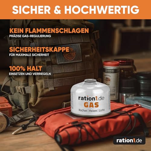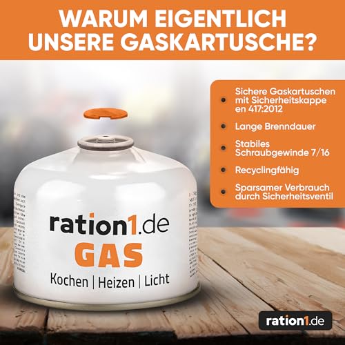 VIELSEITIG EINSETZBAR: Die ration1 Schraubkartuschen 230 g sind ideal für den mobilen Gebrauch geeignet. Mit dem 7/16″ Schraubgewinde passen die Gasflaschen auf Gaskocher, Campinglampen, auf den kleinen Gasgrill, Gasheizer, Campingheizer, Bunsenbrenner, die Gaskühlbox oder eignen sich für Handlötgeräte. Ob bei Outdoor Aktivitäten, Stromausfall oder Gasmangel, hiermit haben Sie jederzeit vorgesorgt • ROBUST & ZUVERLÄSSIG: Schlagfest und stabil ist das Gehäuse der Gaskartusche mit EN 417 Gewinde und Schraubventil. Längere Transportwege im Rucksack oder in der Tasche sind daher kein Problem. Das Gas ist sowohl im Sommer als auch im Winter zu verwenden • SICHER & SPARSAMER VERBRAUCH: Der Gasaustritt erfolgt nur durch das selbstverschließende Sicherheitsventil. Das abdichtende Sicherheitsventil öffnet sich nur, wenn der Anschluss aufgeschraubt ist, ansonsten tritt kein Gas aus. Die Kartuschen sind mit einer Sicherheitskappe versehen und entsprechen zudem der Norm EN 417:2012 • RECYCLINGFÄHIG: Die Gaskartuschen bestehen aus Rohstoffen, die fachgerecht recycelt werden können. Entsorgen Sie diese einfach über den gelben Sack oder die gelbe Tonne. Bitte beachten Sie dabei, dass die Kartuschen restlos geleert sein müssen • IDEAL KOMBINIERBAR: Schließen Sie die Gaskartusche an einen Kartuschen-Kocher an und erwärmen Sie Ihre Fertiggerichte des ration1 Notvorrat. Ob im Notfall, abends am See, auf der Almhütte oder beim Camping, hiermit haben Sie stets leckeres Essen und können Gasgeräte zum Grillen oder Heizen betreiben • ACHTUNG! GASKARTUSCHE MIT SCHRAUBGEWINDE: Passt dies zu Ihrem Anschluss? Bei Fragen wenden Sie sich gerne an unseren Kundenservice – wir freuen uns, Sie beraten zu dürfen!
