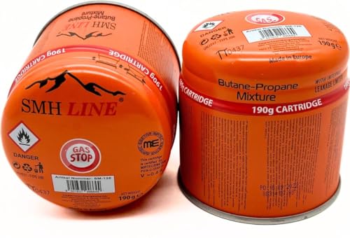 SMH LINE 36x 190g Stechkartusche Butan/Propan mix Gaskartusche Gas-Sto-System. Ideal für die Camping, Bunsenbrenner, Grill, Heizung, Lötpistolen, und andere Outdoor Aktivitäten Kartusche • Unsere Stechkartuschen ist mit 190 g Butan/Propangas sehr ergiebig und erfüllt die Sicherheitsnorm Gas-Sto-System. Nach EU-Norm DIN EN 417:2012 mit integriertem Gasblocksystem • Gaskartusche für Lötlampe, Lötbrenner, Gasbrenner, Brenner, Lötmeister, Campingkocher, Gaskocher, Kocher, Kartuschenkocher, Campinglampen und viele andere Geräte, auch wenn sie noch nicht restlos entleert sind. Meer Nützlich Ideal, wenn man unterwegs mehrere Geräte mit nur einer Kartusche betreiben muss. • Das verbaute Gas Block System verhindert, dass Gas unkontrolliert austritt, wenn die Kartusche vom Gerät getrennt wird. Die Montage ist sehr leicht: Einfach die Kartusche in das Gerät eindrehen und schon kann es losgehen. • Inhalt einer Gaskartusche: 190g Butan-Propan Gasgemisch, Maße: H 9 cm x Ø 9 cm • Sicher und Solide.