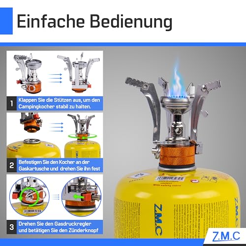 PRÄZISE + FLEXIBLE HITZE: Der Gaskocher bietet durch den Drehknopf die stufenlose Regulierung der Flamme, was für eine optimale Temperaturkontrolle beim Kochen sorgt. So bereiten Sie beim Camping, der Wandertour und im Kleingarten Speisen optimal zu. • BESONDERS LEICHT: Dieser Gaskocher überzeugt durch sein geringes Gewicht von nur 100g und seine kompakten Abmessungen von 11 x 7,8 cm sowie dem einflammigen Windschutz, was den Mini-Kocher zum idealen Begleiter für jegliche Outdoor-Aktivitäten macht. • EINFACHE HANDHABUNG + SICHERHEIT: Die automatische Piezo-Zündung ermöglicht ein schnelles und sicheres Entzünden der Flamme ohne Streichhölzer oder Feuerzeug, was den Kocher besonders sicher in der Handhabung, praktisch und benutzerfreundlich macht. • LEISTUNGSSTARK + EFFIZIENT: Mit einer Wärmeleistung von 3200 W und einem moderaten Gasverbrauch von rund 213 g/h ist der Kocher ideal für schnelles und effizientes Kochen. Die Gaskartusche wird per 7/16″ Eurogewinde direkt unter den Kocher geschraubt. • IDEAL FÜR OUTDOOR-EINSATZ: Dieser aus rostfreiem Stahl gefertigte Kocher ist langlebig und widerstandsfähig gegen Witterungseinflüsse, wodurch er der perfekte Begleiter für Ihre Aktivitäten ist. Die wasserdichte Box bietet eine sichere Aufbewahrung.