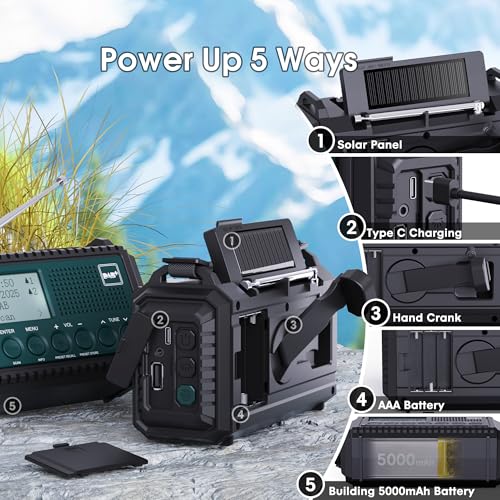 📻 [ DAB+ Radio & Automatic Scan Kurbelradio ] : Das DAB Radio vorgesehen für outdoor, ist sein Geld wert. DAB+ bietet Ihnen eine gestochen scharfe und klare Audioqualität und sucht automatisch nach allen verfügbaren Radiosendern und zeigt sie auf dem großen LCD-Display an (DAB-Frequenzbereich 5A 174.928-13F 239.200MHz). Darüber hinaus verfügt dieses Digitalradio auch über eine senderspeicherfunktion, sie können problemlos bis zu 60 sender speichern(30 DAB/30 FM) • 🔋 [ 5 Stromquellen & 5000mAh Power Bank ] : Der interne wiederaufladbare Batterie mit 5000 mAh kann entweder über die Kurbel, das Solarpanel oder Micro-USB aufgeladen werden. Legen Sie 3-teilige AAA-Batterien (nicht im Lieferumfang enthalten) ein und schalten Sie die POWER-Taste auf AAA. Die Solar Radio verfügt über 1 USB-Anschluss. Machen Sie sich keine Sorgen, dass Ihrem Telefon oder anderen Geräten der Strom ausgeht, wenn Sie im Freien sind, Das kurbelradio mit handyladefunktion solar kann auch als Heimgerät verwendet werden notfall ausrüstung stromausfall. • 💡[ Taschenlampe und Leselampe mit 2 Helligkeitsstufen ]: Das notfallradio dynamo radio verfügt über eine Taschenlampe und ein faltbares Leselicht mit zwei Helligkeitsoptionen: hohe Helligkeit oder normale Helligkeit. Eine helle Taschenlampe kann im Dunkeln für genügend Leistung sorgen und Sie und Ihre Lieben im Notfall aus der Dunkelheit heraushalten. und ein faltbares Leselicht kann im Winkel eingestellt werden, um das Lesen bei Nacht zu erleichtern. • ⛑ [ IPX4 Wasserdicht & SOS-Alarm ]: ROCAM batterie radio aus starkem ABS-Material, das IPX4 wasserdicht ist. kleine Regentropfen, die auf das Gerät spritzen, beschädigen das Gerät nicht. Sehr bequem zu tragen für Camping, Reisen, Angeln oder andere Outdoor-Aktivitäten. Wenn Sie sich in einer Notsituation befinden, geraten Sie bitte nicht in Panik. SOS-Alarm mit Taschenlampe rotes Licht kann dazu beitragen, dass Sie sich sicher fühlen, wenn Sie Hilfe brauchen und niemand um Sie herum ist. • ❤[ Mehr Funktionen für Ihren täglichen Bedarf ] : Das Notfallradio hat FM RDS-Funktion, können Sie deutlich auf dem Bildschirm die Kanal-Informationen des Programms, das Sie hören zu sehen. 3,5-mm-Kopfhörerbuchse ermöglicht es Ihnen, Ihre Lieblings-Radio zu genießen, ohne andere zu stören, Dual Alarme und Schlaf-Timer helfen Ihnen, eine bessere Routine zu bekommen. Sperrtaste, um versehentliches Drücken der Tasten zu vermeiden.