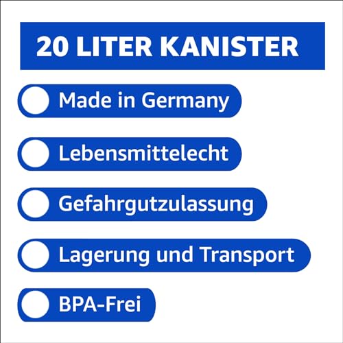 EIGENSCHAFTEN: lebensmittelecht (geruchs- und geschmacksneutral). Absolut luft- und wasserdicht. Stapelbar und palettengerecht. Mit Auslaufhahn für einfaches Ausgießen. Lichtundurchlässig. Kindersichere Verpackung nach DIN EN 28317. Zur Bevorratung mit frischem Trinkwasser. Notfall Ausrüstung für den Katastrophenfall wie vom Bundesamt für Bevölkerungsschutz und Katastrophenhilfe (BBK) vorgeschlagen • GETRÄNKEKANISTER für Trinkwasser, Säfte, Wein, Most, Getränke. Auch für Laugen, Öle oder Säuren geeignet. ALS LAGERKANISTER und Getränkefass für Camping, Outdoor, Werkstatt, Garten, Haushalt, Speise- und Vorratskammer, Keller, Balkon, Wohnwagen, Bau, unterwegs im Auto, Festivals, Picknicks, Wanderungen, Matschküche, als Wassertank, Wasserbehälter, Trinkwasserkanister, Fass, Als Wasserspender usw… • KOMPLETT ENTLEERBAR, keine nervigen Reste mehr. Qualität „Hergestellt in Deutschland“. Mit UN-Zulassung. Bisphenol A(BPA) frei. Kein Einwegkanister. 100% Recycelbar • Abmessung LxBxH (cm): ca. 29 x 26 x 38 | Material: Polyethylen hoher Dichte (HDPE) | Etikettenfeld BxH in (mm): 220 x 160 | UN-Zulassung • LIEFERUMFANG: 6 Kanister 20 Liter (DIN 61) blau. 6 Schraubverschlüsse (DIN 61 mit Dichteinlage und Originalitätsring). 1 Auslaufhahn (DIN 61)