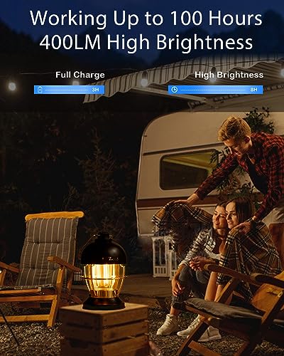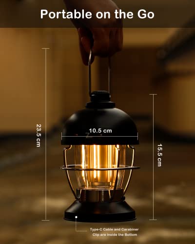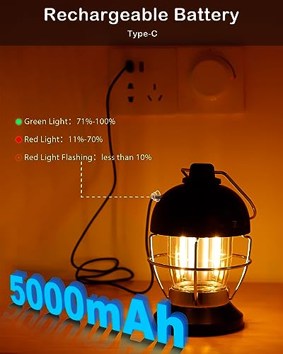 【Eingebauter Wiederaufladbarer 5000mAh Akku und Überladeschutz】 Die Akkukapazität ist größer als die durchschnittlicher Campinglaternen. Das vollständige Aufladen dauert mit dem mitgelieferten 1 Meter Typ-C Kabel nur 3 Stunden. Die Batteriestromanzeige leuchtet einmal grün auf voll aufgeladen. Campinglampe at einen eingebauten Überladeschutz im Inneren, machen Sie sich keine Sorgen über Schäden an dieser Laterne, wenn Sie mit einem anderen Standard Netzstecker nicht 5V aufladen. • 【Ultrahelle 400LM und bis zu 100 Stunden Laufzeit】 Unterscheidet sich von anderen Laternen, ist dieses mit Wolfram Licht entworfen und bietet eine magische, romantische, entspannende Atmosphäre im Garten. 400 Lumen LED Glühbirne bietet eine 360°Abdeckung ausreichend Helligkeit, es kann Ihre Outdoor-Escapade für 100 Stunden niedrigste Helligkeit beleuchten, und Arbeit als Tischlampe für 8 Stunden bei höchster Helligkeit. • 【3 Leuchtmodi,0–100% Stufenloses Dimmen, Einfache Bedienung mit Einem Knopf】Es verfügt über 3 Beleuchtungsmodi – weißes Licht, warmes Licht, warmweißes Licht,die einfach durch Drehen des Schalters am oberen Körper der Lampe eingestellt werden können. Eine sehr sanfte Steuerung ermöglicht die Einstellung der Helligkeit auf Ihre Komfortstufe (0-100 %) – von überaus hell bis überaus dunkel. Selbst bei höchster Helligkeit helles,aber nicht blendendes Licht,schonender für die Augen, ohne zu blenden. • 【Offensichtliche Anzeige,die den Batteriekapazitätsstatus anzeigt】Die Batterieanzeige befindet sich auf der Rückseite der Ladeschnittstelle.Im Lademodus wechselt sie von Rot zu Grün,sobald sie vollständig aufgeladen ist.Im Arbeitsmodus, wenn die Anzeige rot ist und blinkt warnt Sie,dass die Batteriekapazität unter 5% liegt.Wenn es rot wird,bedeutet dies, dass die Batteriekapazität zwischen 5% und 15% liegt. Wenn es grün wird, bedeutet dies,dass die Batteriekapazität zwischen 15% und 100% liegt. • 【Retro-Stil, IPX4 wasserdicht mit festen Materialien, abnehmbare untere Abdeckung】 Abmessungen dieser Laterne sind nur 15.5 * 10.5 * 10.5 cm und wiegen 390 g, mit einem Metallgriff oben, Typ-C-Kabel und Karabinerhaken befinden sich in der unteren Abdeckung, tragbar auf der go.waterproof und staubdicht für Outdoor Aktivitäten wie Wandern, Camping, Zelten, Angeln, Jagen usw. Es kann aus allen Winkeln vor Spritzwasser schützen, kann jedoch nicht teilweise oder vollständig untergetaucht werden. • 【Ein unverzichtbares Notfall Überlebenskit】Die Camping Lampen mit wiederaufladbarem 5000 mAh Akku für lange Laufzeit, kompakte Größe, damit sie für Aktivitäten im Freien leicht zu tragen und zu handhaben ist, leuchtet in einer Not-Ausschaltsituation oder Stromausfall bei Tornados, Hurrikanen und extreme Schneestürme.