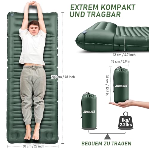 DICKER UND BEQUEMER: Die JEMULICE Isomatte misst nach dem Aufblasen 200cmx68cmx12cm. Die Extra Dicke von 12cm schützt Ihren Körper vollständig vor kaltem und rauem Boden, egal ob Sie flach oder auf der Seite liegen, Sie können jederzeit maximalen Komfort genießen. Innovatives integriertes Kissen und integrierte ergonomische kleine Airbags passen sich den Körperkonturen an, um optimale Passform zu gewährleisten, das Hängegefühl zu verringern und den Liegekomfort zu erhöhen. • ULTRALEICHT UND KLEINES PACKMASS: Unser isomatte camping selbstaufblasend lässt sich nach dem Zusammenrollen perfekt im Rucksack verstauen. Die isomatte ultraleicht wiegt nur 2.2 Pfund! Im kompakten Packmaß von 31cmx15cm ist sie ideal für Rucksacktouren und Camping. Die beste Wahl für Wanderer, die bei Campingabenteuern höchsten Komfort suchen Komfort suchen. • SCHNELLES AUFBLASEN MIT FUSSPUMPE: Um eine bessere Benutzererfahrung zu bieten, sind die Aufblasfußpumpe und das Entleerungsventil anders positioniert, um Luftverluste zu vermeiden und ein schnelleres Aufblasen und Entleeren zu erreichen. In nur 60 Sekunden lässt sich die JEMULICE luftmatratze selbstaufblasend vollständig mit der eingebauten Fußpumpe aufpumpen. Kein Aufblasen mehr mit dem Mund oder einer Luftpumpe, es ist arbeitssparender, bequemer und hygienischer als mit dem Mund zu blasen oder mit den Händen zu drücken. • LANGLEBIGES MATERIAL UND SUPER UNTERSTÜTZEND: Die JEMULICE aufblasbare matratze ist mit schweren Ripstop 40D Nylon und innere TPU Verbundwerkstoff, hautfreundlich, wasserdicht und langlebig, die diese camping matte Leistung besser in schweren Bedingungen macht und das Gewicht von 500kg nach der Inflation zu widerstehen; Sie können auf Wiedersehen zu wunden Rücken und andere Beschwerden in der Regel durch Unebenheiten und Felsen unter dem Boden Ihres Zeltes links sagen! Es ist eine perfekte aufblasbare isomatten für Ihr Zelt. • ERWEITERBARES SPLEIßDESIGN UND VIELSEITIG: Flexibler Schlafkomfort für Zwei. Dank des speziellen Spleißdesigns können zwei JEMULICE selbstaufblasbare luftmatratze einfach zu einer großen Matte verbunden werden, perfekt für Paare oder Familien. Für Jede Outdoor-Aktivität Geeignet, Egal ob Camping, Wandern, Picknicks oder Festivals, die JEMULICE camping matratze ist Ihre zuverlässige Begleiterin.