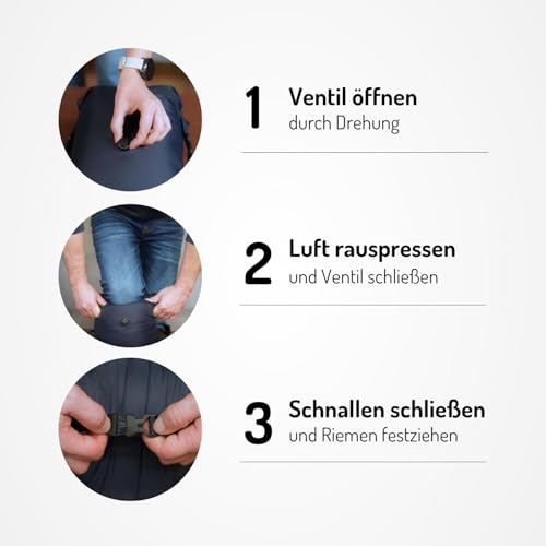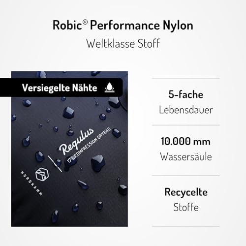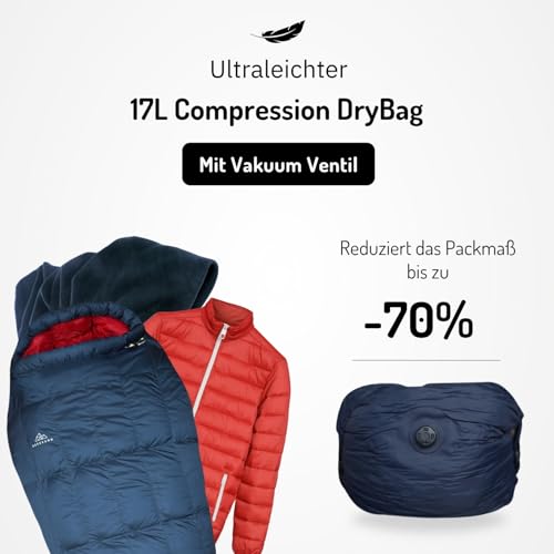 KOMPRESSIONSSACK MIT VENTIL: Ultraleichter und wasserdichter Dry Bag 15l – 20l. Erzeugt ein temporäres Vakuum und reduziert das Packmaß von z.B. 3-Jahreszeiten Schlafsäcken aus Daune um bis zu 70%. • ROBIC Performance Nylon: Wasserdichter Packsack mit 10.000 mm Wassersäule aus ROBIC Performance Nylon. 3 x stärker als Standard-Nylon, 6 x stärker als Standard-Polyester. Gewicht nur 60g. • VERWENDUNG: Wasserfester Beutel / waterproof bag um z.B. Schlafsäcke, dicke Jacken oder Kleidung zu komprimieren. Mit diesem wasserdichten Beutel bleibt alles trocken mit minimalen Packmaß. • EINSATZGEBIETE: Wasserdichter Sack, ideal für Camping, Wandern, Trekking, Fahrradtouren, Bikepacking, Reisen, Motorrad Reisen & überall wo wasserdichte Kompressionssäcke notwendig sind. • NACHHALTIGE MATERIALIEN: Recyceltes Performance Nylon sowie hitze- und kälteresistente Schnallen von WOOJIN machen diesen „Packsack wasserdicht ultraleicht“ zu einem nachhaltigen Qualitätsprodukt.