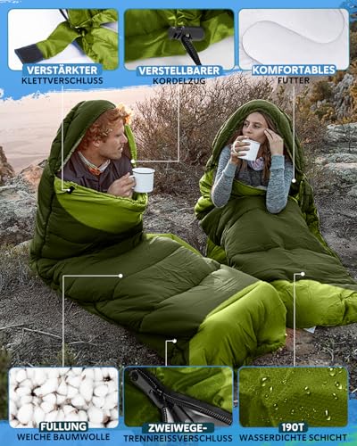 [Hochleistungs-Schlafsäcke] geeignet für die vier Jahreszeiten, die bequeme Temperatur des Schlafsäckes beträgt 10-25 ° C, luftdurchlässige, wasserdichte Außenschicht in Kombination mit leichter hohler Baumwollenfüllung bietet eine hervorragende Wärmeabdeckung, die auch unter extremen Wetterbedingungen bequem bleibt. • [Einzigartiges Design] Diese Schlaftasche verfügt über ein praktisches Design mit Doppelreißverschluss, leicht ausziehen und bequem zu gelangen; Füße unabhängige Reißverschluss, die den Füßen mehr Freiheit, Flexibilität und Komfort; Und in der Tasche, um Ihre kleinen Sachen aufzunehmen, machen Sie Ihren Aufenthalt im Freien angenehmer. • [Einfach zu tragen] Der Schlafsack ist 220 x 75 cm groß und kann leicht in den mitgelieferten Kompresssack gefaltet werden. Er nimmt keinen Platz ein, egal ob Sie Wandern, Camping oder andere Outdoor-Aktivitäten unterwegs sind. • [Wasserdicht und maschinenwaschbar] Hergestellt aus 190T Polyestergewebe mit winddichten, wasserdichten und reißfesten Eigenschaften. Gleichzeitig unterstützt es die Maschinenwasche, die Reinigung und Wartung sind sehr bequem, sodass Sie Zeit und Mühe sparen können und die Sauberkeit und Leistung des Schlafsacks lange halten können. • [Multifunktionsschlafsäcke] Der Kopfgurt kann bei kaltem Wetter für zusätzliche Wärme gezogen werden. Der linke und rechte Reißverschluss verwandelt einen Schlafsack in nur wenige Sekunden in zwei Schlafsacks, um Ihre unterschiedlichen Bedürfnisse im Freien zu erfüllen.