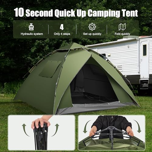 SUPER GROßER RAUM FÜR 3-4 PERSONEN: 4 Personen Familienzelt Campingzelt ist das perfekte Familienzelt, das Sie je gesehen haben. Geräumiger Innenbereich: 230 x 230 cm, Höhe Mitte: 150 cm. 4 Mann Zelt verfügt über praktische Lampenaufhängung und garantiert mit vier stabilen, biegsamen Fiberglasstangen höchste Standfestigkeit. Pop up zelt 2-3 personen nach dem Falten hat das eine Größe von nur 70 x 18 x 18 cm, wodurch es sehr bequem zu tragen ist und Sie können eine komfortable und schöne Reise. • SCHNELLER AUF- UND ABBAU IN 30 SEKUNDEN: Keine besonderen Fähigkeiten erforderlich! Eine Person kann das Zelt mit dem automatischen Hydrauliksystem innerhalb von 30S leicht aufstellen! Wurfzelt vorab angebrachte, stabile Stäbe und eine leichte Struktur machen den Aufbauprozess einfach und effizient, Auch für Anfänger einfach zu handhaben – einfach an der Sicherheitsschnur ziehen, den Faltstab ausklappen und mit den mitgelieferten Heringen fixieren! Damit mehr Zeit für Abenteuer bleibt! 8 Stahlpfähle und 4 Windseile sorgen für die langfristige Haltbarkeit und Stabilität des Pop up Zeltes. • WASSERDICHT & SONNENSCHUTZ: Das 3-4 Mann Zelt besteht aus wird vom langlebigen 210D PU 3000mm Oxford Material mit einer doppellagigen Konstruktion, UV-Schutz und einer wasserdichten Beschichtung gemacht. Das strapazierfähige 210D Oxford-Groundsheet, regendicht und abnehmbare Zeltplane ist für eine Vielzahl von Wetterbedingungen geeignet. Unser Pop Up Zelt hält Dich trocken und geschützt. Alle Nähte sind mit einem schützenden Dichtband versehen! • GUTE BELÜFTUNG & WINDWIDERSTAND: Mit 2 seitlichen Mesh-Fenstern, vorderen und hinteren Doppeltüren und einer oberen Belüftung, insgesamt 5 Belüftungsöffnungen und hochdichten Mesh-Sieben an der Innenseite der vorderen und hinteren Türen sind das Familie Kuppelzelt belüftet und gleichzeitig wind- und mückensicher. Unabhängig von der Jahreszeit kann es für eine gute Belüftung sorgen und eine angenehme Temperatur im Inneren des großen Zeltes aufrechterhalten, was die beste Camping-Erfahrung bietet! • 2 IN 1 DOPPELSCHICHT ZELT FÜR MULTIFUNKTION: Das abnehmbare Schnellöffnungszelt enthält abnehmbare Außen- und Innenzelte, die für sehr unterschiedliche Zwecke verwendet werden können. Als Ganzes kann es als windfestes und regenfestes zweilagige Instant-Kuppelzelt genutzt werden. Die äußere Zeltplane kann als Sonnenschutz, äußere Zeltplane, Pavillon, Markise, Baldachin, Strandzelt, Parkzelt oder Angelzelt usw. verwendet werden. Bringen Sie eine wunderbare und romantische Reise.