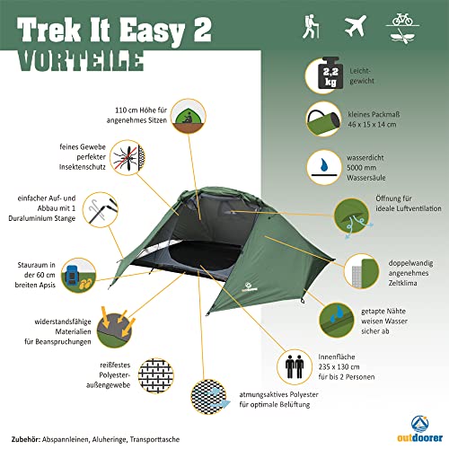 Robustes, leichtes Trekkingzelt mit nur 2,2 kg und Minipackmaß ( 46 x 15 x 14 cm) – für mehrtägige Wandertouren und Abenteuer in der Natur • Ideal großes 2-Personen-Zelt: 240 x 130 x 110 cm + 60 cm Apsis für das Gepäck – zusätzlicher Platz durch Webbings • Ultraleichtzelt für Einsteiger und Fortgeschrittene: Schneller Aufbau dank innovativem Fix-up-System leicht gemacht – mehr Zeit, um die Wildnis zu genießen • Doppelwandiges Leichtzelt sorgt wasserdicht für gute Belüftung, Vermeidung von Kondenswasser und hohen Windschutz: 5.000 mm Wassersäule, mit Moskitonetz • Lieferumfang: Leichtes Zelt mit Campingausrüstung für Trekkingtouren – Aluminiumheringe, Abspannleinen und Transporttasche • Ersatzteile jederzeit verfügbar: Du kaufst einen Klassiker von outdoorer und kannst auch nach vielen Jahren der Nutzung jederzeit auch mal auf ein Ersatzgestänge oder eine Transporttasche problemlos erhalten. Unser Kundenservice freut sich jederzeit über deine Anfrage. • Regionaler Hersteller: Du kauft ein Qualitätsprodukt von einem Familienunternehmen mit Standorten in Deutschland und Österreich. • 100% Ökostrom: Wir setzen in unseren Standorten in Deutschland und Österreich zu 100% auf erneuerbare Energie bzw. Ökostrom und nutzen ausschließlich elektrisch betriebe Fahrzeuge. • Zelt-Recycling: Nicht mehr einsatzfähige Zelte bekommen in unserer Näh-Manufaktur ein zweites Leben und werden zu wunderschönen Seesäcken und Strandtaschen verarbeitet.