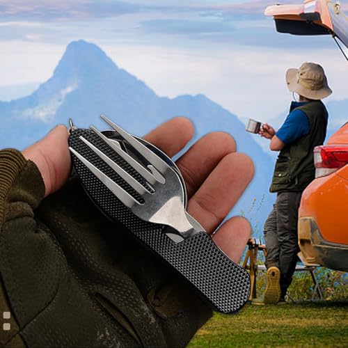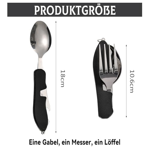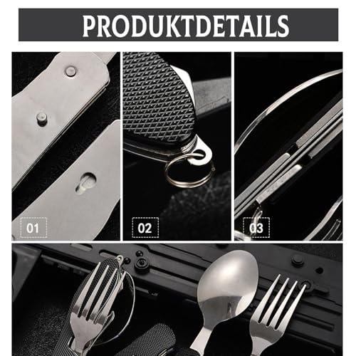| 🎯Use Case | Kompaktes 3-in-1 Campingbesteck aus Edelstahl; Messer, Gabel, Löffel klappbar, ideal für Camper, Wanderer und minimalistische Outdoor-Küche. |