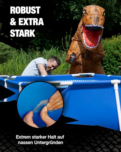 UNTERWASSER ANWENDBAR: Das wasserdichte Klebetape klebt selbst auf nassen Oberflächen & ist ideal zum schnellen Abdichten und Reparieren von Rissen in Pools, Rohren, Schläuchen oder im Badezimmer • EXTREM FLEXIBEL & DEHNBAR: Dank innovativer R-Flex Technologie dehnt sich das Tape auf bis zu 700 % der Länge. Es passt sich jeder Form an & sorgt für zuverlässige Reparaturen bei jedem Einsatz • HITZE- & UV-BESTÄNDIG: Das transparente Panzerband hält Temperaturen von -5°C bis +60 °C aus. Es eignet sich perfekt für Notfall Anwendungen im Außenbereich bei Sonne, Regen oder Kälte • NAHEZU UNSICHTBAR: Durch das transparente Material bleibt das Panzertape optisch dezent. Ideal für unauffällige Reparaturen an Oberflächen in Kombination mit Wasser & Feuchtigkeit wie Poolfolien oder undichte Rohre • T-REX POWER & QUALITÄT: T-Rex steht für DIY-Spirit, Abenteuerlust & echte Outdoor-Qualität. Unsere Klebebänder vereinen erhöhte Widerstandsfähigkeit mit robuster Dino-Kraft für anspruchsvolle Einsätze
